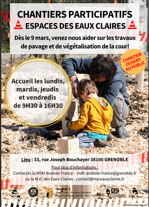 Communication :  » Venez nous aider à végétaliser l’espace des Eaux Claires! Chantier participatif organisé par la ville de Grenoble le jeudi 02, vendredi 03 et lundi 13 avril en journée. Le chantier a lieu au 33, rue Joseph Bouchayer au niveau de la MJC des Eaux Claires. Tout le monde est le bienvenu.
