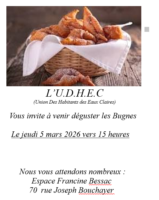 L’U.D.H.E.C (Union Des Habitants des Eaux Claires) vous invite à venir déguster les Bugnes, le jeudi 5 mars 2026 vers 15 heures.