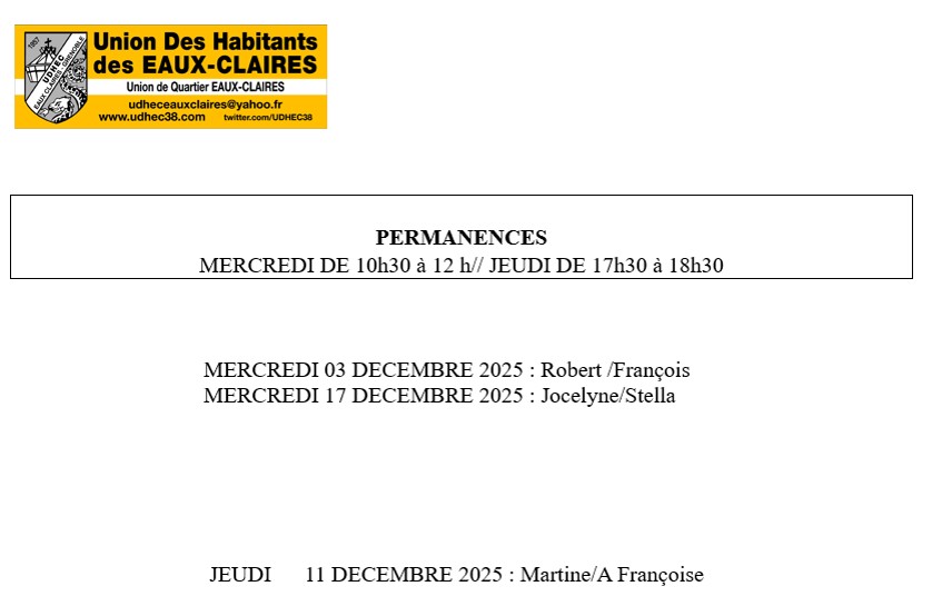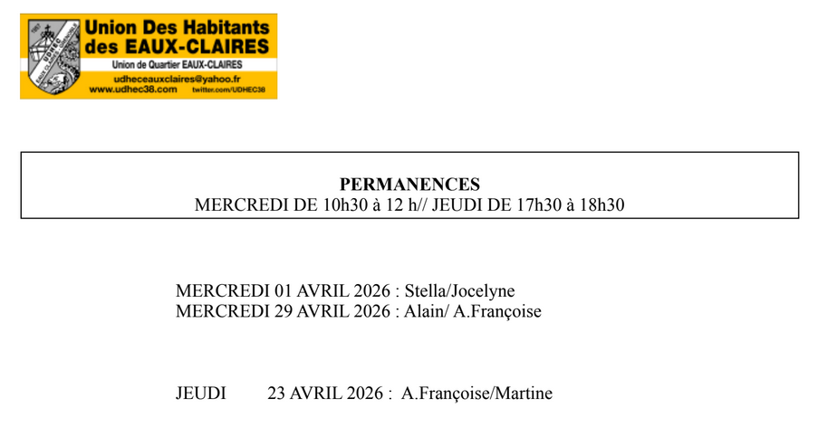 Ci-dessous les dates des prochaines permanences et les personnes qui assurent la permanence au bureau de l’Union de Quartier.