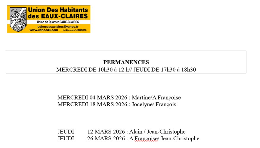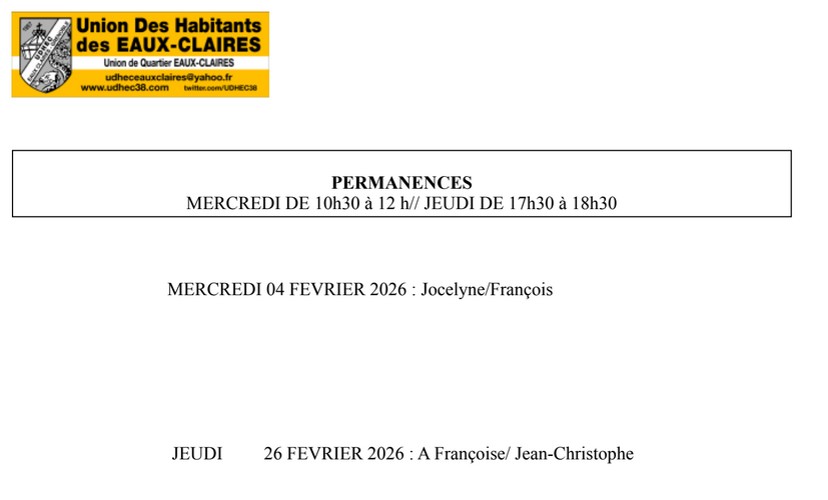 Ci-dessous les dates des prochaines permanences et les personnes qui assurent la permanence au bureau de l’Union de Quartier.